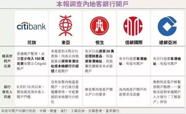 内地人的大量涌入,让多家香港银行收紧了政策,提高了门槛。自2016年以来,多家银行收紧了内地投资者对香港见证开户的资格,比如: