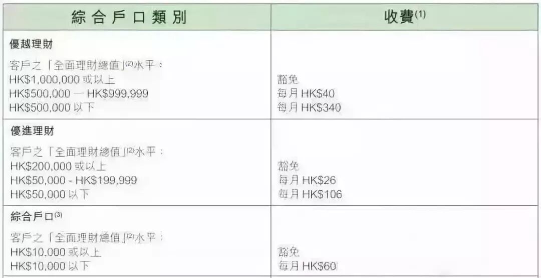 卓越理财:平均每日最低结余100万港币,不足者收取380港币/月。