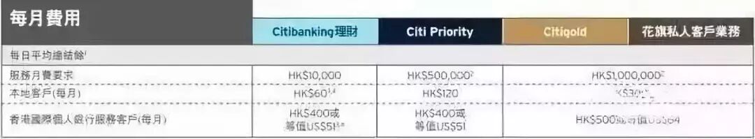 Citigold:平均每日最低结余100万港币,不足者按季度收取300港币。