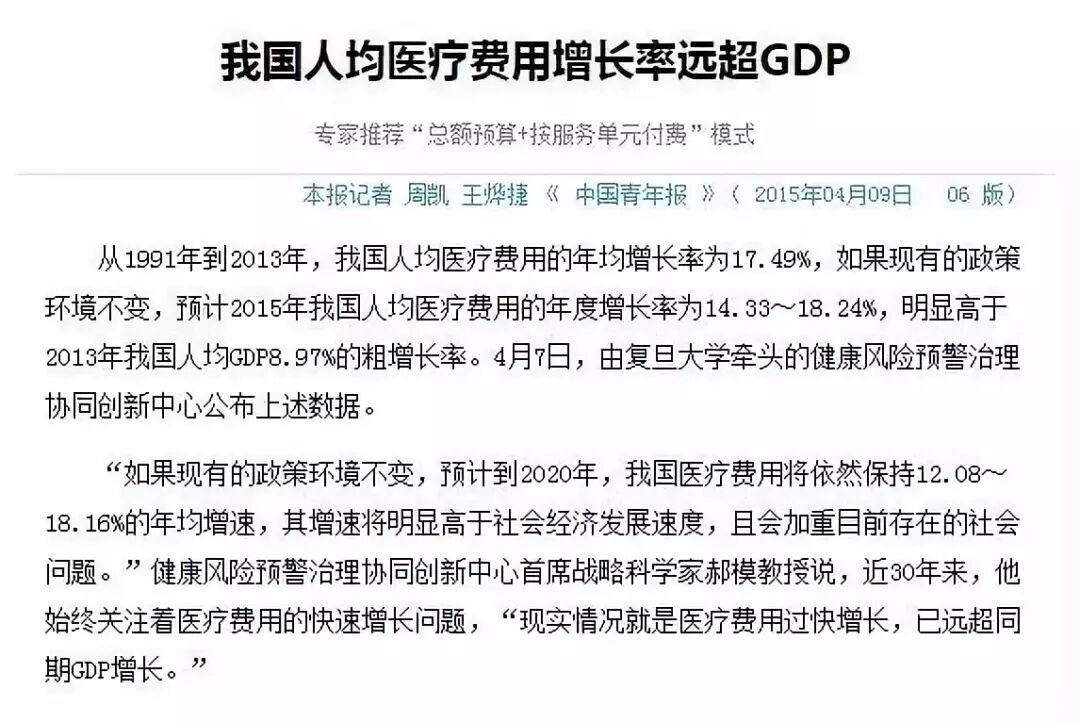 人均医疗费用每年增长在18%左右,也就是说现在做一个心脏搭桥手术的手术费是20万,那20年后就约为60万。